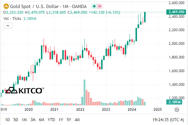 Giá vàng thế giới tăng mạnh với vàng giao ngay tăng 47,5 USD, tương đương 1,96% lên 2.469,1 USD/ounce.