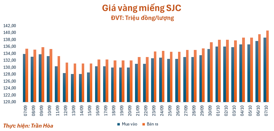 Đầu phiên giao dịch sáng nay (7/10), giá vàng miếng SJC tiếp tục tăng mạnh, niêm yết ở mốc 138,6 – 140,6 triệu đồng/lượng, tăng 1 triệu đồng/lượng ở cả chiều mua và bán ra so với giá khảo sát sáng qua. Chênh lệch giá mua vào - bán ra ở ngưỡng 2 triệu đồng/lượng.