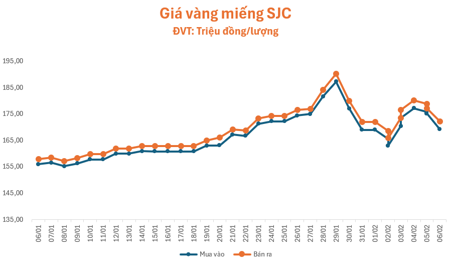 Phiên giao dịch sáng nay (06/02), giá vàng tiếp tục lao dốc. Lúc 09 giờ 30 phút, giá vàng miếng SJC ở hầu hết các cửa hàng lớn như Phú Quý, Bảo Tín Minh Châu, Doji và PNJ đồng loạt giảm mạnh, niêm yết ở mức 169,2 – 172,2 triệu đồng/lượng (mua – bán), giảm 5 triệu đồng/lượng ở chiều mua và chiều bán so với giá khảo sát chiều qua, chênh lệch hai chiều tăng lên ngưỡng 3 triệu đồng/lượng.