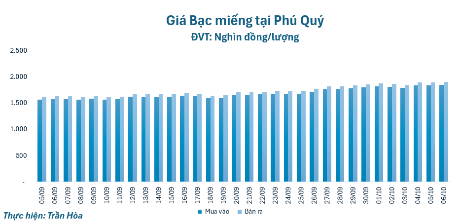 Tại Phú Quý, giá bạc tăng 14.000 đồng/lượng ở cả chiều mua và chiều bán, đạt mức 1.851.000 – 1.908.000 đồng/lượng. Giá bạc thỏi 1kg đạt mốc 50,799 triệu đồng.
