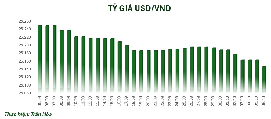 Ngân hàng Nhà nước công bố tỷ giá trung tâm ở mức 25.146 VND/USD, giảm 16 đồng so với mức đóng cửa tuần trước. Tại một số ngân hàng thương mại lớn cũng đa số giao dịch ở mức thấp hơn phiên trước. Cụ thể, Vietcombank giảm 17 đồng cả chiều mua và chiều bán, đang niêm yết ở mốc 26.153 – 26.403 VND/USD (mua - bán).