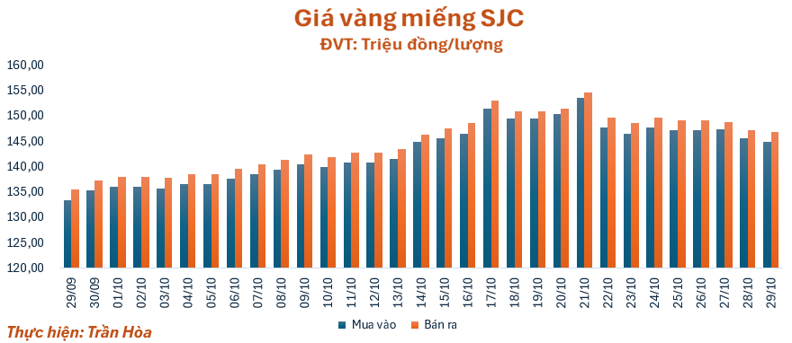Phiên giao dịch sáng nay (29/10), lúc 10 giờ giá vàng miếng SJC được điều chỉnh giảm so với giá khảo sát sáng qua, quanh mốc 144,9 – 146,9 triệu đồng/lượng (mua – bán), giảm 0,8 triệu đồng/lượng ở chiều mua và giảm 0,3 triệu đồng/lượng ở chiều bán. Chênh lệch giá mua vào - bán ra ở ngưỡng 2 triệu đồng/lượng.