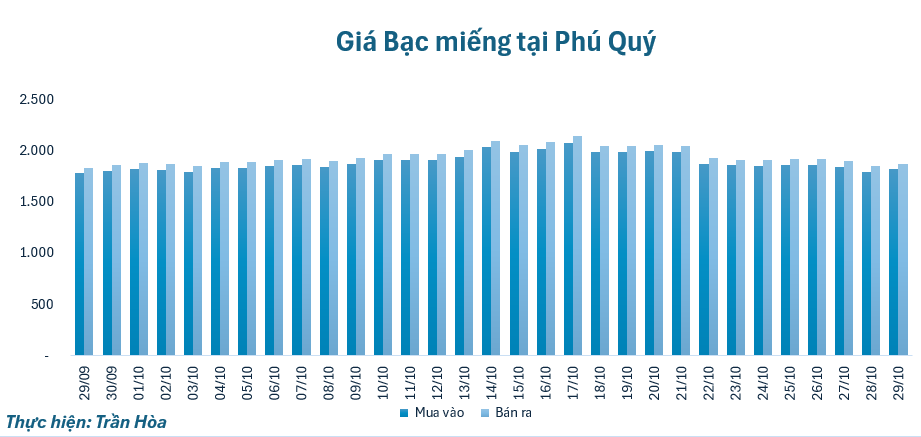 Giá bạc sáng 29/10 đảo chiều tăng trở lại so với phiên sáng qua, tại Phú Quý, giá bạc tăng 23.000 đồng ở cả chiều mua và chiều bán, đạt mốc 1.819.000 – 1.875.000 đồng/lượng.