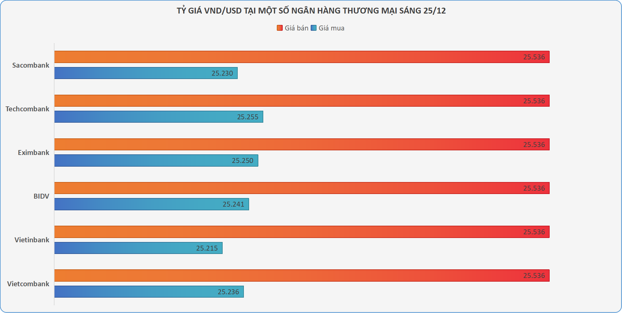 Techcombank giá USD đang niêm yết ở mức 25.255 - 25.536 VND/USD, giảm 35 đồng ở chiều mua và tăng 13 đồng ở chiều bán so với phiên trước. Trong khi Sacombank niêm yết USD ở mức 25.230 - 25.536 VND/USD, giảm 30 đồng ở chiều mua và tăng 13 đồng ở chiều bán.