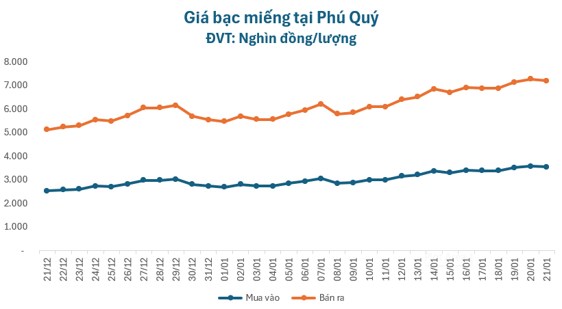 Giá bạc đảo chiều giảm, tại Phú Quý, giá bạc miếng niêm yết ở mức 3.550.000 – 3.660.000 đồng/lượng, giảm 35.000 đồng/lượng ở chiều mua và giảm 36.000 đồng ở chiều bán so với khảo sát chiều qua.