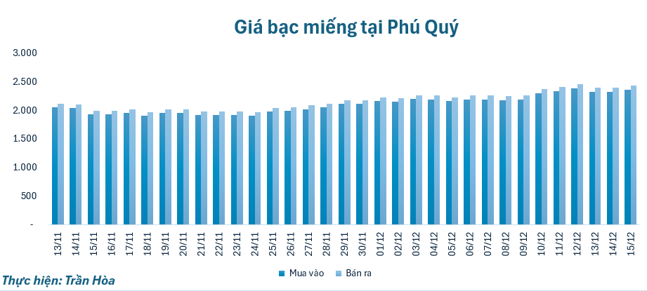 Giá bạc sáng 15/12 tăng so với giá đóng cửa phiên cuối tuần trước, tại Phú Quý, giá bạc miếng niêm yết ở mốc 2.361.000 – 2.434.000 đồng/lượng, tăng 32.000 đồng chiều mua và tăng 33.000 đồng chiều bán so với chốt phiên tuần trước.