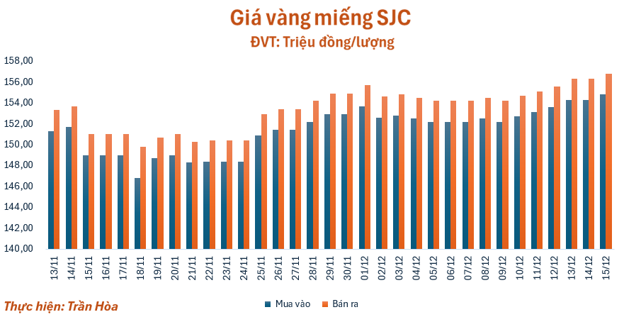 Phiên giao dịch sáng nay (15/12), giá vàng miếng SJC được điều chỉnh tăng 0,5 triệu đồng/lượng so với giá chốt phiên tuần trước, quanh mốc 154,8 – 156,8 triệu đồng/lượng (mua – bán). Chênh lệch giá mua vào - bán ra ở ngưỡng 2 triệu đồng/lượng.