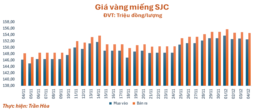 Phiên giao dịch sáng ngày 4/12, giá vàng miếng SJC giảm nhẹ so với giá khảo sát sáng qua, quanh mốc 152,85 – 154,5 triệu đồng/lượng (mua – bán), giảm 0,3 triệu đồng/lượng ở chiều mua và chiều bán. Chênh lệch giá mua vào - bán ra ở ngưỡng 2 triệu đồng/lượng.
