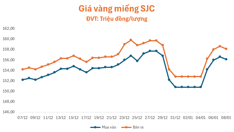 Phiên giao dịch sáng nay (08/01), lúc 9 giờ 30 phút, giá vàng miếng SJC, Bảo Tín Minh Châu, Phú Quý, Doji và PNJ đồng loạt giảm 0,5 triệu đồng/lượng so với giá khảo sát sáng qua, niêm yết ở mức 156,1 – 158,1 triệu đồng/lượng (mua – bán), chênh lệch hai chiều ở ngưỡng 2 triệu đồng/lượng.