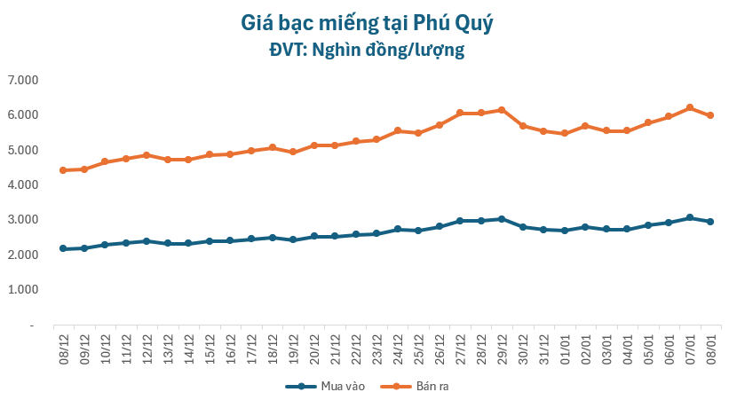 Giá bạc sáng 08/01 đổi chiều giảm mạnh, tại Phú Quý, giá bạc miếng niêm yết ở mức 2.949.000 – 3.040.000 đồng/lượng, giảm 113.000 đồng/lượng ở chiều mua và giảm 117.000 đồng/lượng ở chiều bán so với giá khảo sát sáng ngày hôm qua.