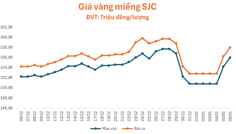 Phiên giao dịch ngày hôm nay (06/01), lúc 10 giờ, giá vàng miếng SJC, Bảo Tín Minh Châu, Doji và PNJ đồng loạt tăng 1,8 triệu đồng/lượng so với giá khảo sát sáng qua, niêm yết ở mức 156 - 158 triệu đồng/lượng (mua – bán), chênh lệch hai chiều ở ngưỡng 2 triệu đồng/lượng.