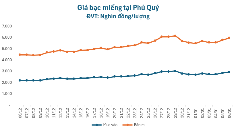 Giá bạc sáng 06/01 tiếp tục đà tăng mạnh, tại Phú Quý, giá bạc miếng niêm yết ở mức 2.934.000 – 3.025.000 đồng/lượng, tăng 83.000 đồng/lượng ở chiều mua và tăng 86.000 đồng/lượng ở chiều bán so với giá khảo sát sáng ngày hôm qua.
