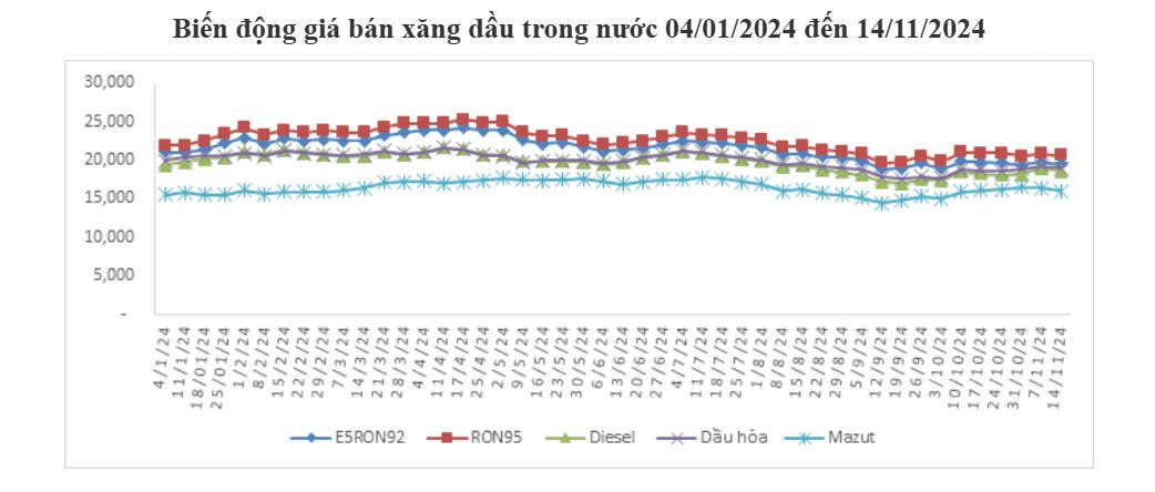 Trước đó, trong phiên giao dịch ngày 7/11, mặt hàng xăng dầu trong nước đồng loạt tăng. Xăng E5 RON 92 tăng 336 đồng/lít, xăng RON95-III tăng 351 đồng/lít, dầu diesel tăng tăng 769 đồng/lít, dầu hỏa tăng 461 đồng/lít và dầu mazut giảm 67 đồng/kg.