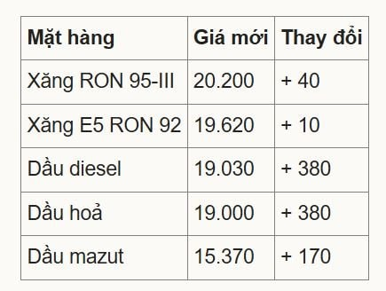 Theo đó, giá xăng RON 95-III (loại phổ biến trên thị trường) tăng 40 đồng, lên 20.200 đồng một lít, E5 RON 92 thêm 10 đồng, ở mức 19.620 đồng.