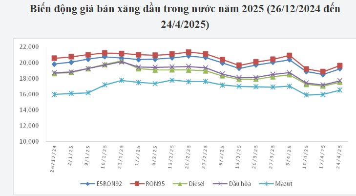 Cụ thể, từ 15h chiều nay (24/4), giá xăng RON 95 được điều chỉnh tăng thêm 780 đồng/lít, nâng giá bán lẻ lên 19.630 đồng/lít. Xăng E5 RON 92 cũng tăng 740 đồng/lít, lên mức 19.230 đồng/lít.