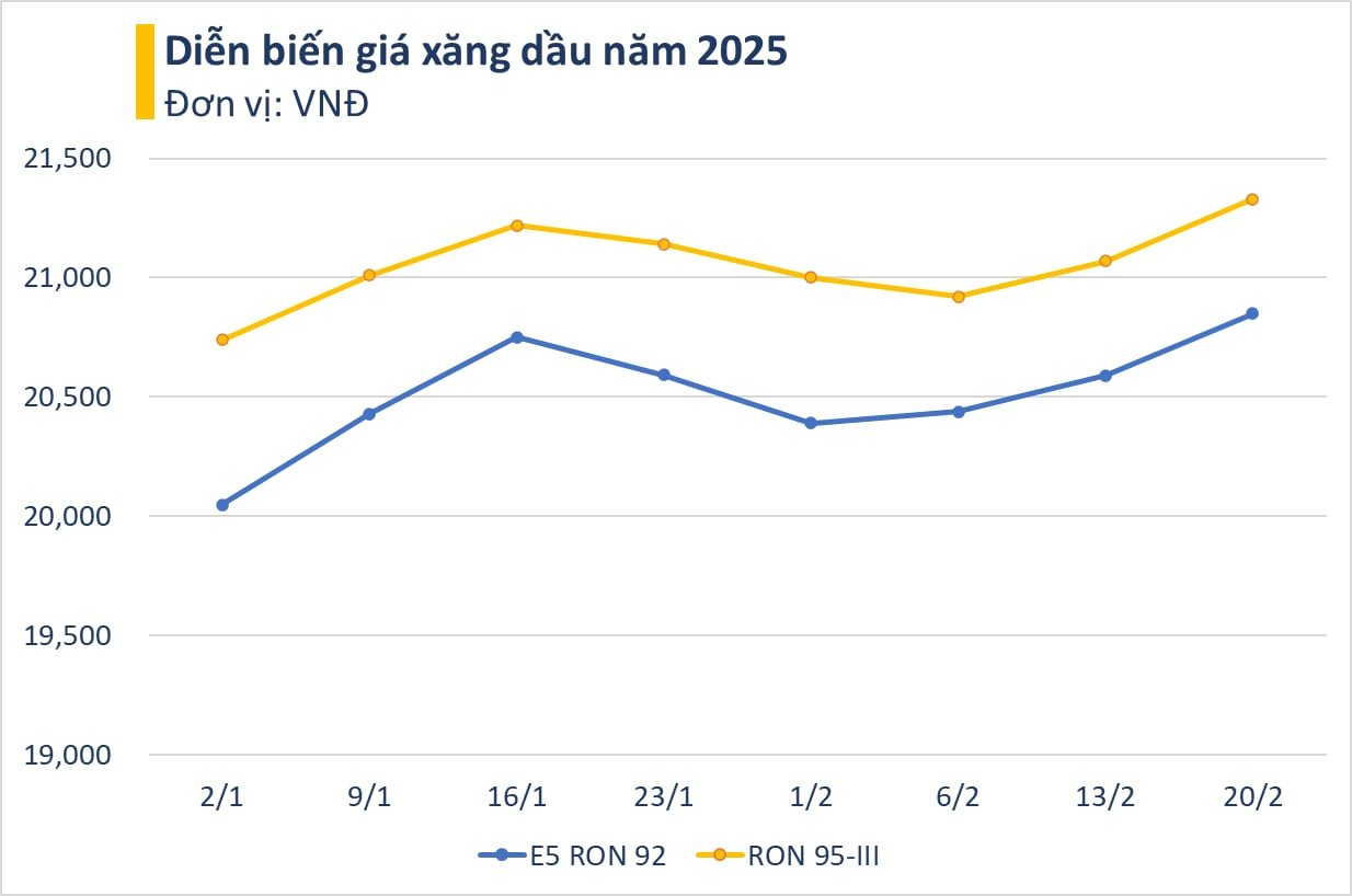 Tại kỳ điều hành gần đây nhất (ngày 13/2), giá xăng E5 RON 92 và RON 95 cùng tăng 150 đồng/lít. Sau điều chỉnh, giá bán lẻ tối đa với xăng E5 RON 92 là 20.590 đồng/lít và xăng RON 95 là 21.070 đồng/lít. Giá dầu diesel tăng 20 đồng/lít lên 19.070 đồng/lít.
