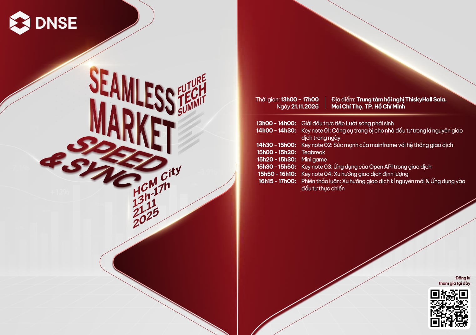 Đây là cơ hội vàng để thúc đẩy thanh khoản, tăng tính linh hoạt trong đầu tư, đồng thời cũng đặt ra yêu cầu mới về hạ tầng, tốc độ xử lý và khả năng quản trị rủi ro cho các công ty chứng khoán và nhà đầu tư. DNSE Future Tech Summit 2025 sẽ là diễn đàn kết nối, chia sẻ và định hướng cho cộng đồng đầu tư hướng tới kỷ nguyên giao dịch tốc độ cao sắp tới.