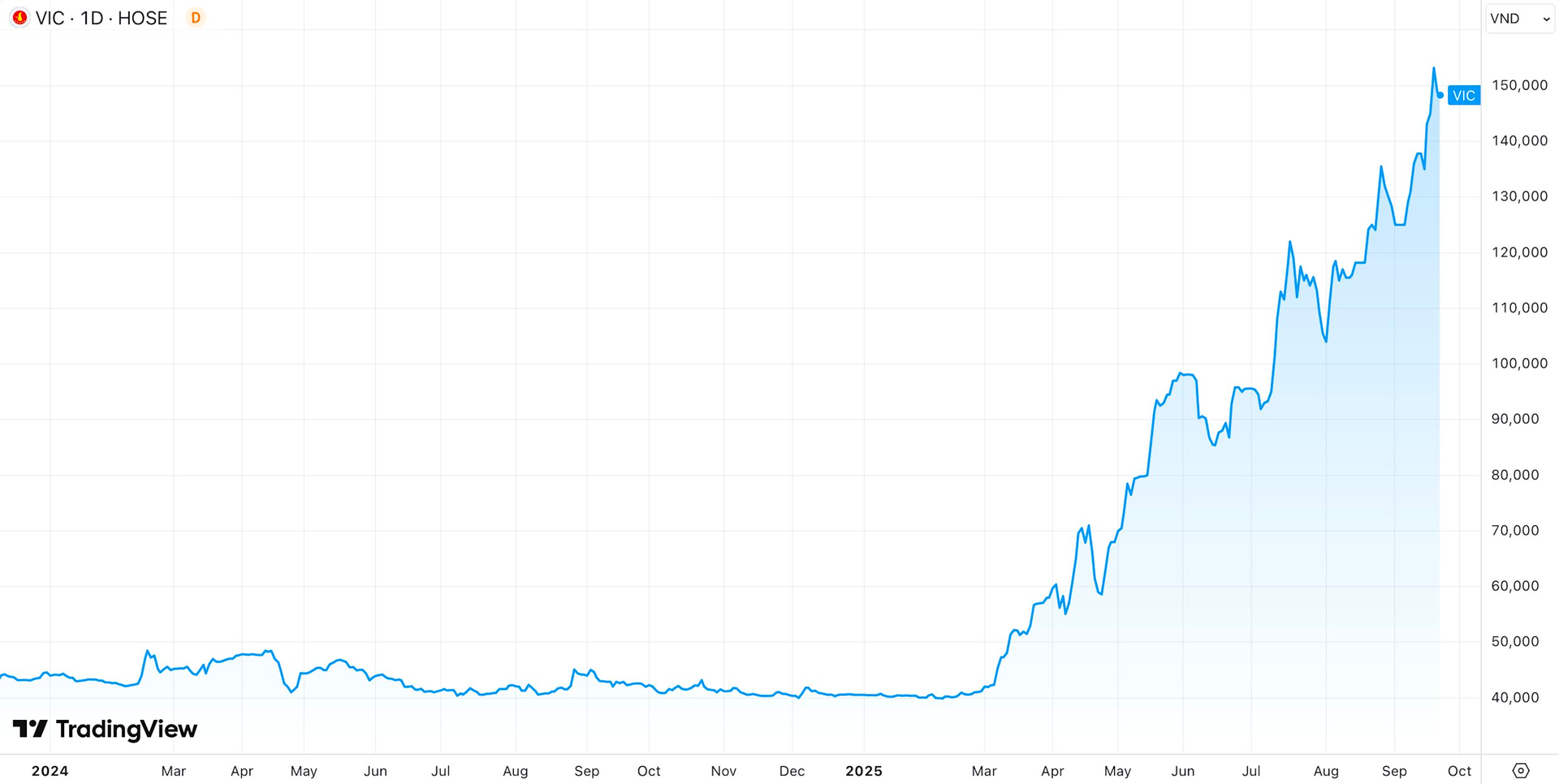 Trong 2 tuần qua, thị trường chứng khoán chứng kiến một trong những diễn biến đáng chú ý nhất năm 2025: cổ phiếu VIC của Tập đoàn Vingroup liên tục lập đỉnh mới, vốn hóa lên cao nhất hơn 590.000 tỷ đồng (khoảng 22 tỷ USD).