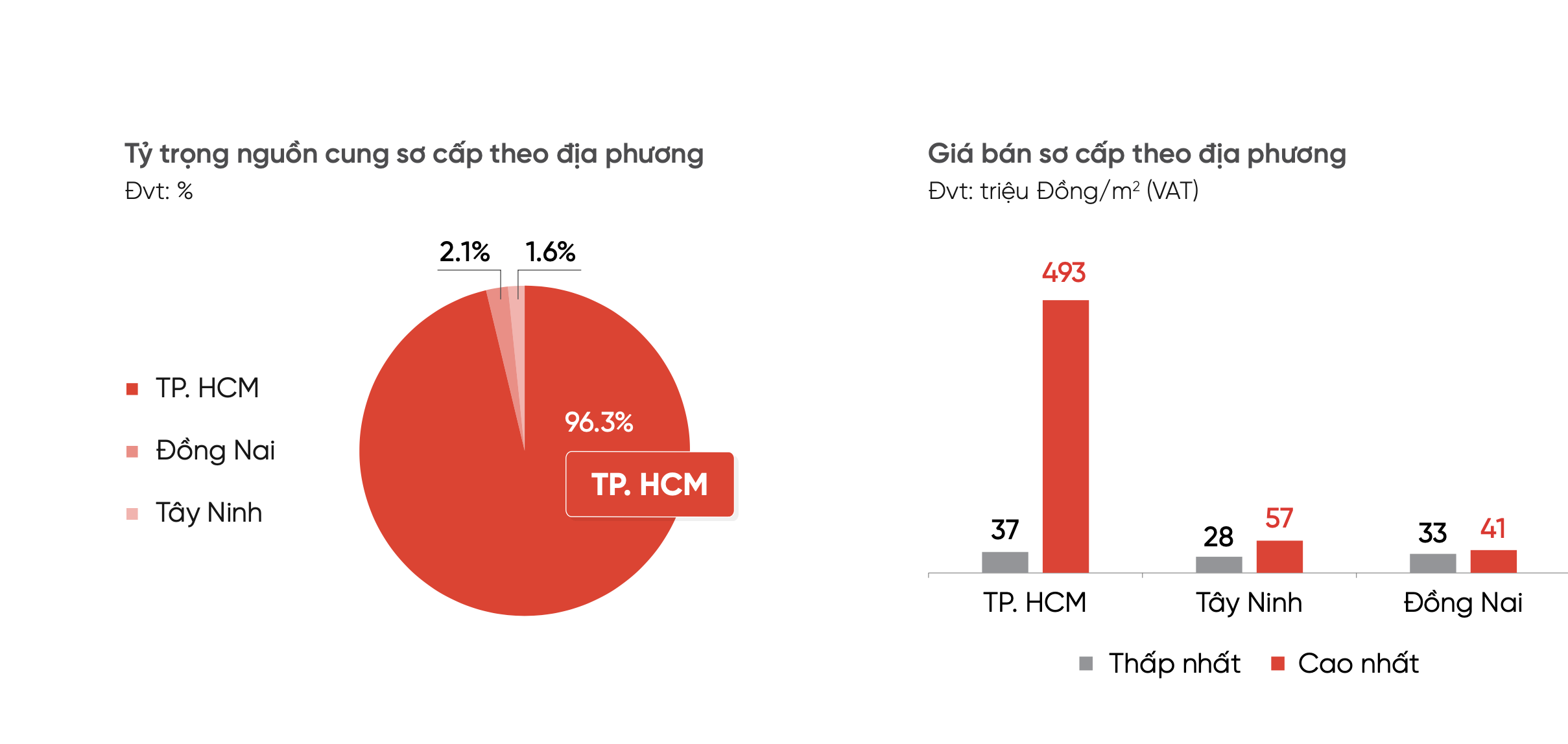 Bên cạnh đó, mặt bằng giá bán sơ cấp ghi nhận tăng 2% - 6% so với tháng trước. Tại TP.Hồ Chí Minh giá sơ cấp căn hộ đạt mức 493 triệu đồng/m2 (mức giá cao nhất); trong khi giá cao nhất tại Tây Ninh và Đồng Nai lần lượt là 57 và 41 triệu đồng/m2. Ở thị trường thứ cấp, giá bán cũng như thanh khoản ổn định, các giao dịch tập trung ở những dự án thuận tiện kết nối về khu vực trung tâm thành phố, pháp lý hoàn thiện, đã bàn giao nhà và có tiến độ xây dựng nhanh chóng.