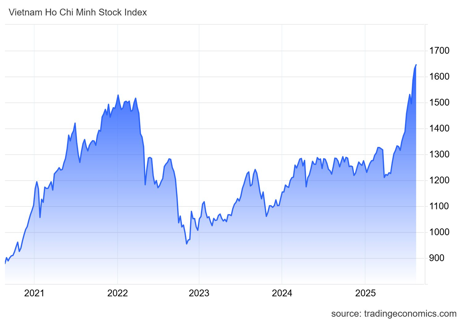 Theo quan sát của ông Ngô Minh Đức, Founder Công ty Cổ phần Đầu tư tài chính LCTV, từ ngày 9/4 đến đỉnh gần nhất tại mốc 1.688 điểm, chỉ số VN-Index đã tăng hơn 600 điểm – tương đương khoảng 60% chỉ trong vòng 4 tháng. Đây là mức tăng trưởng rất ấn tượng, được hỗ trợ mạnh mẽ bởi các yếu tố vĩ mô như chính sách tài khóa – tiền tệ nới lỏng, đẩy mạnh giải ngân đầu tư công, Nghị quyết 68 hỗ trợ khu vực tư nhân, cũng như sự ổn định của tỷ giá và mặt bằng lãi suất thấp.