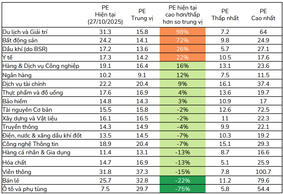 Theo BSC, các nhóm ngành đang được trả mức định giá cao, ghi nhận hiệu suất tốt đều là các nhóm ngành ghi nhận mức tăng trưởng mạnh trong 9 tháng đầu năm và triển vọng năm 2026 như bất động sản, dịch vụ tài chính, ngân hàng, bán lẻ, dầu khí.