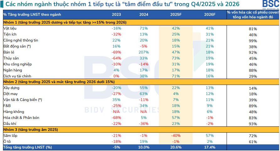 BSC nhận định các nhóm ngành tiếp tục là tâm điểm đầu tư trong quý cuối năm và kéo sang năm 2026 là những nhóm tăng trưởng lợi nhuận dương trong năm 2025 và kỳ vọng đạt mức tăng trưởng từ 15% trở lên trong năm 2026. Bao gồm vật liệu, tiện ích, công nghệ thông tin, bất động sản, bán lẻ, thủy sản, khu công nghiệp, ngân hàng và dịch vụ tài chính.