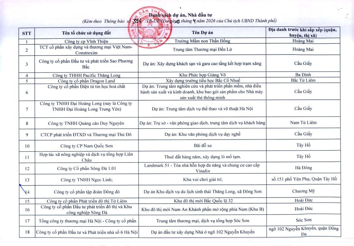 UBND TP.Hà Nội vừa ban hành Thông báo số 396/TB-UBND ngày 13/4/2026 về việc tổ chức rà soát, xử lý dứt điểm các dự án vốn ngoài ngân sách có sử dụng đất chậm triển khai trên địa bàn TP.