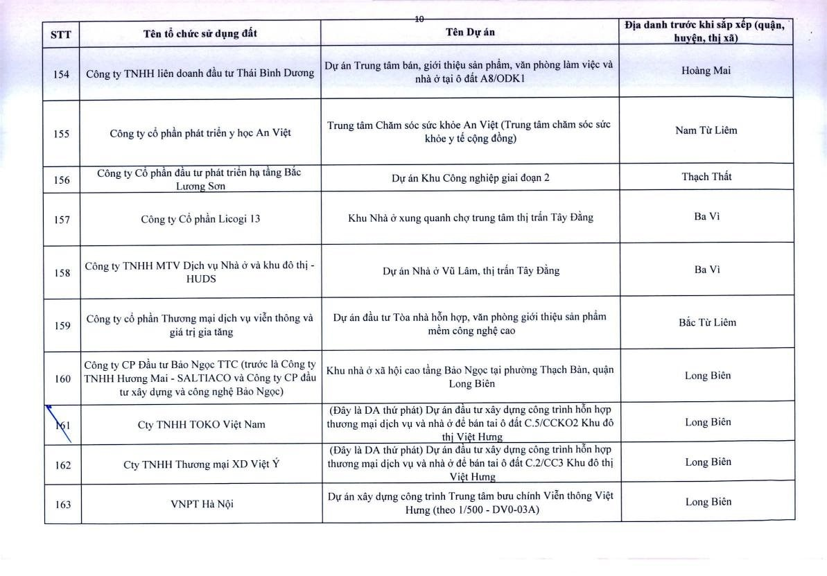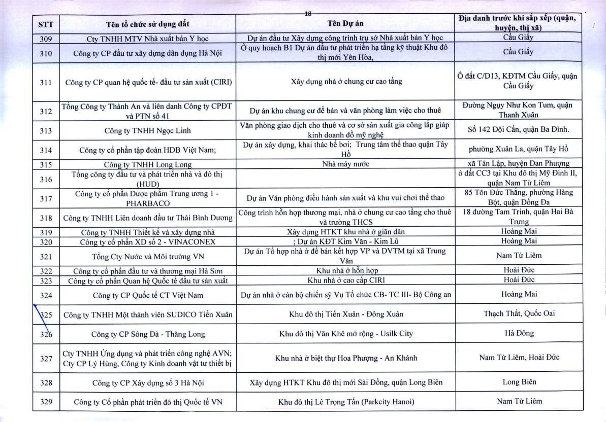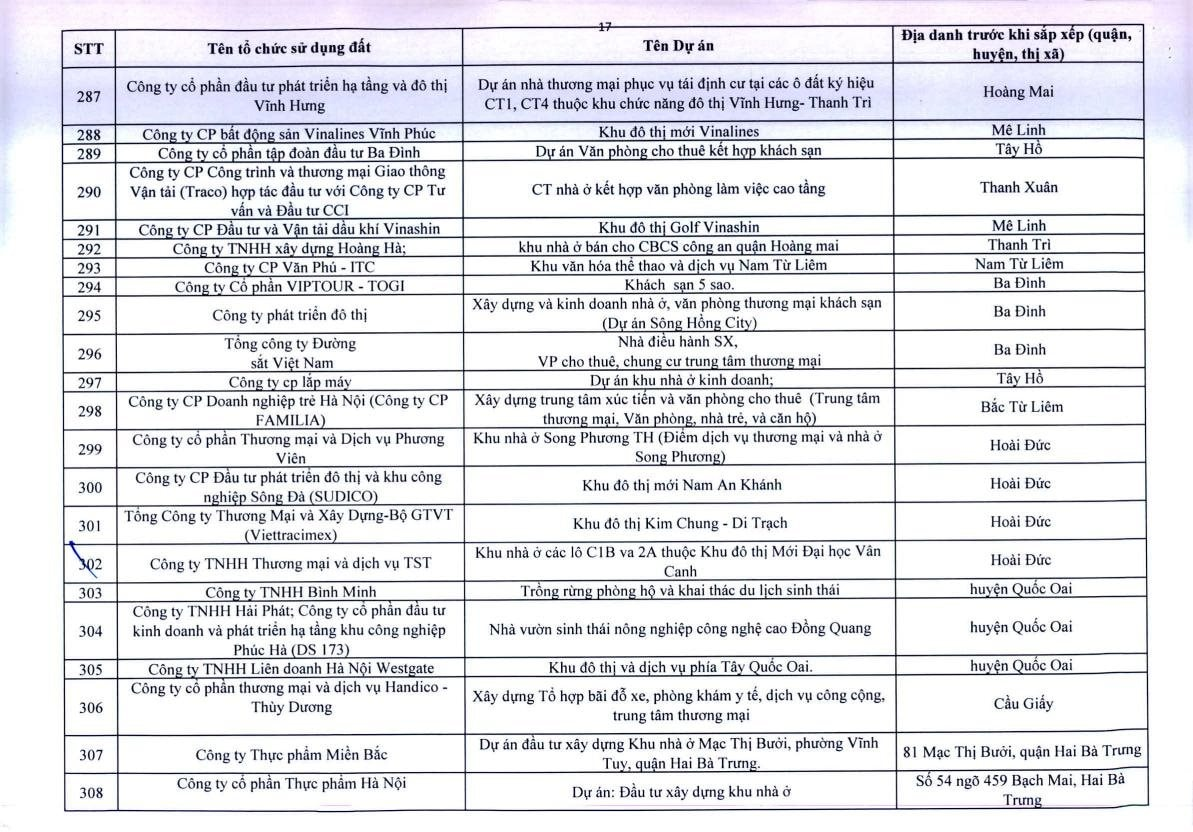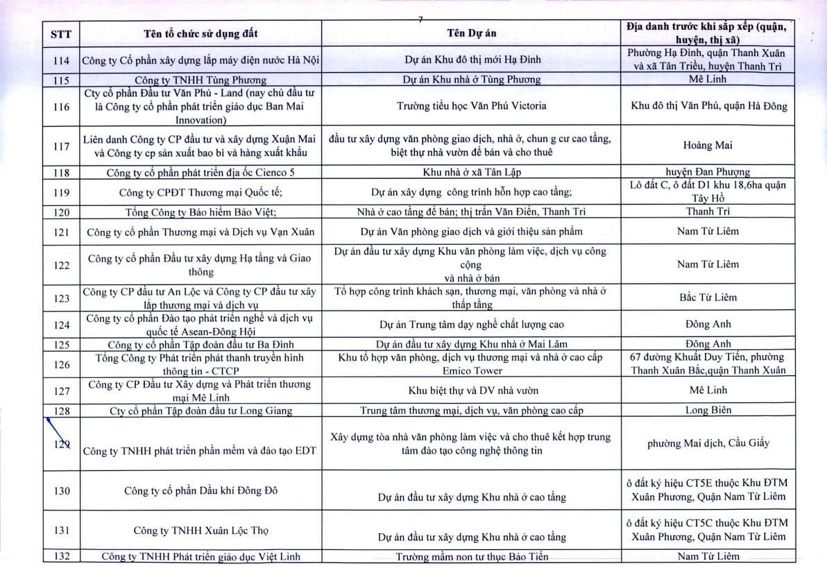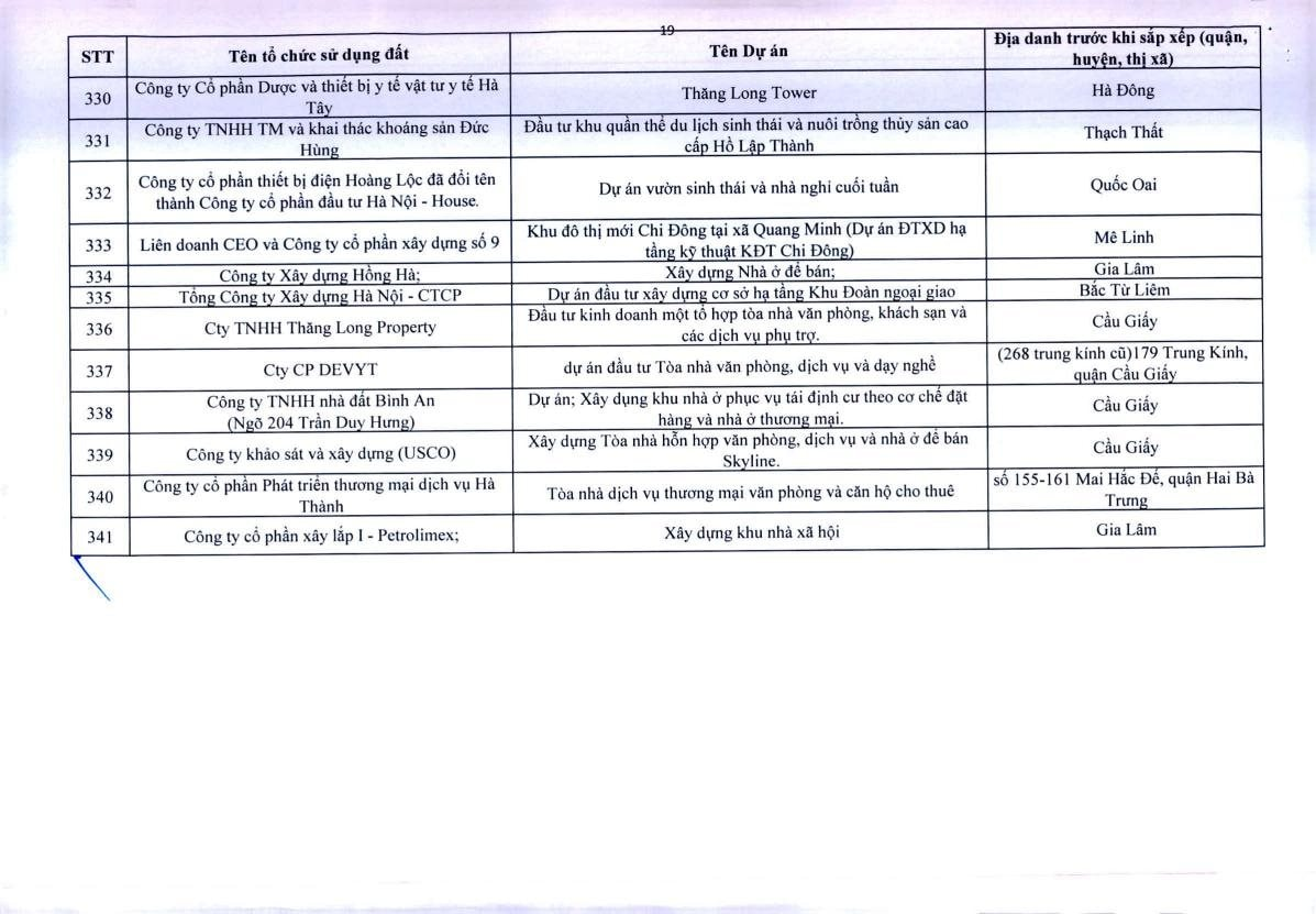 Theo Thông báo, trên địa bàn TP.Hà Nội, có 341 dự án vốn ngoài ngân sách có sử dụng đất chậm triển khai. Đáng chú ý, có nhiều doanh nghiệp bất động sản đình đám bị "điểm tên" trong danh sách ban hành kèm thông báo 396/TB-UBND của UBND TP.Hà Nội như: Công ty Liên doanh Cao ốc quốc tế Hồ Tây; Công ty CP quan hệ quốc tế- đầu tư sản xuất (CIRI); Công ty CP sản xuất- dịch vụ - xuất nhập khẩu Từ Liêm; Công ty TNHH đầu tư Central Capital; Công ty CP Bất động sản Hoa Anh Đào;...