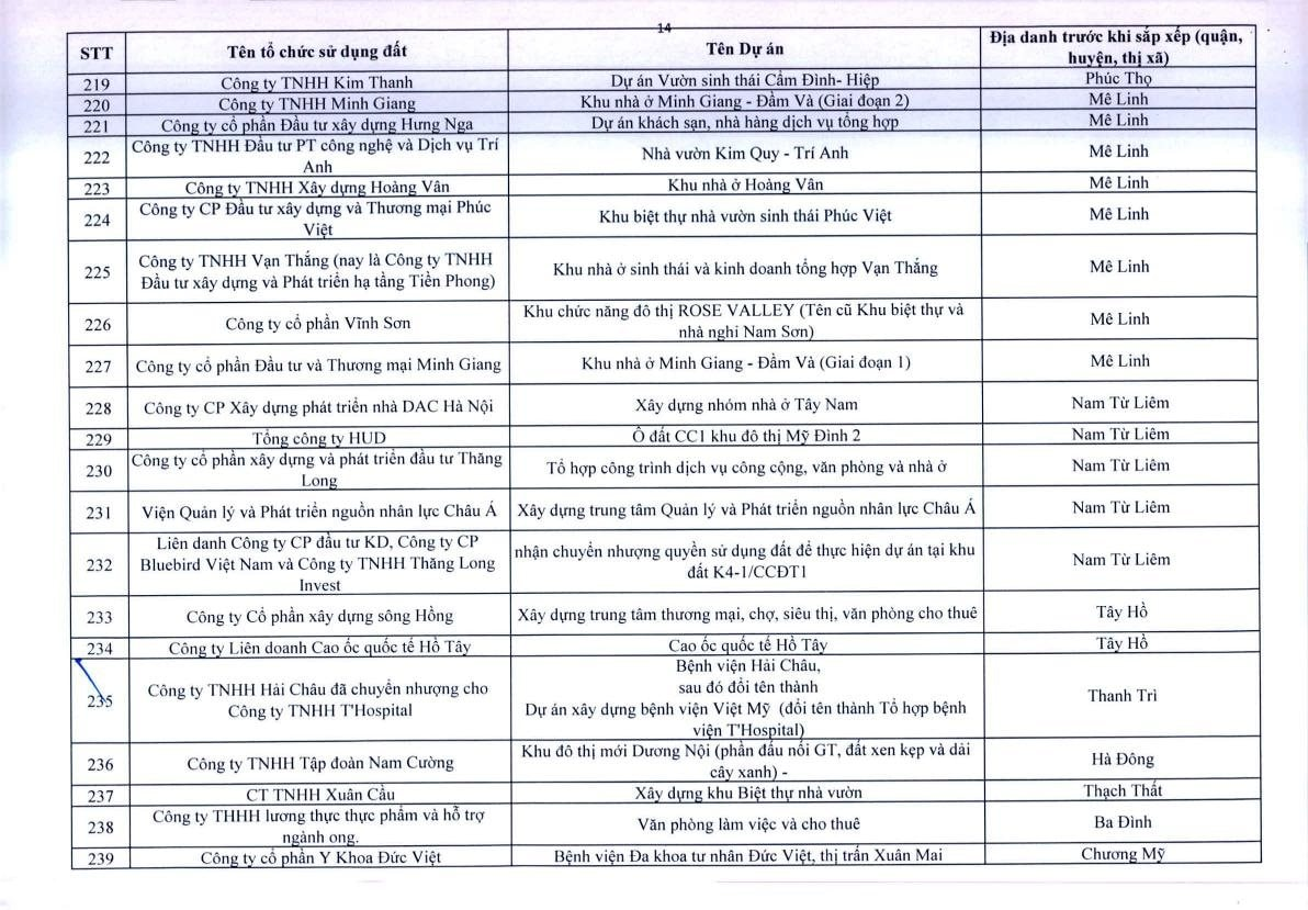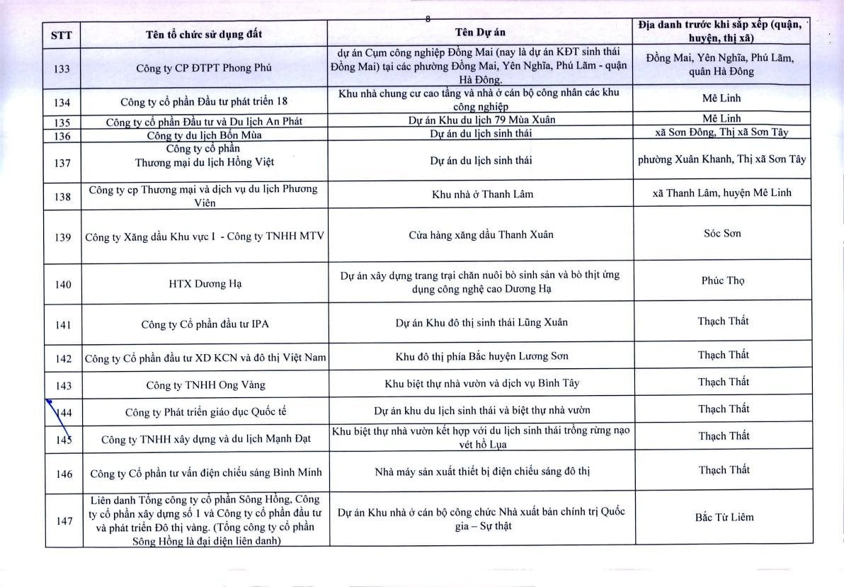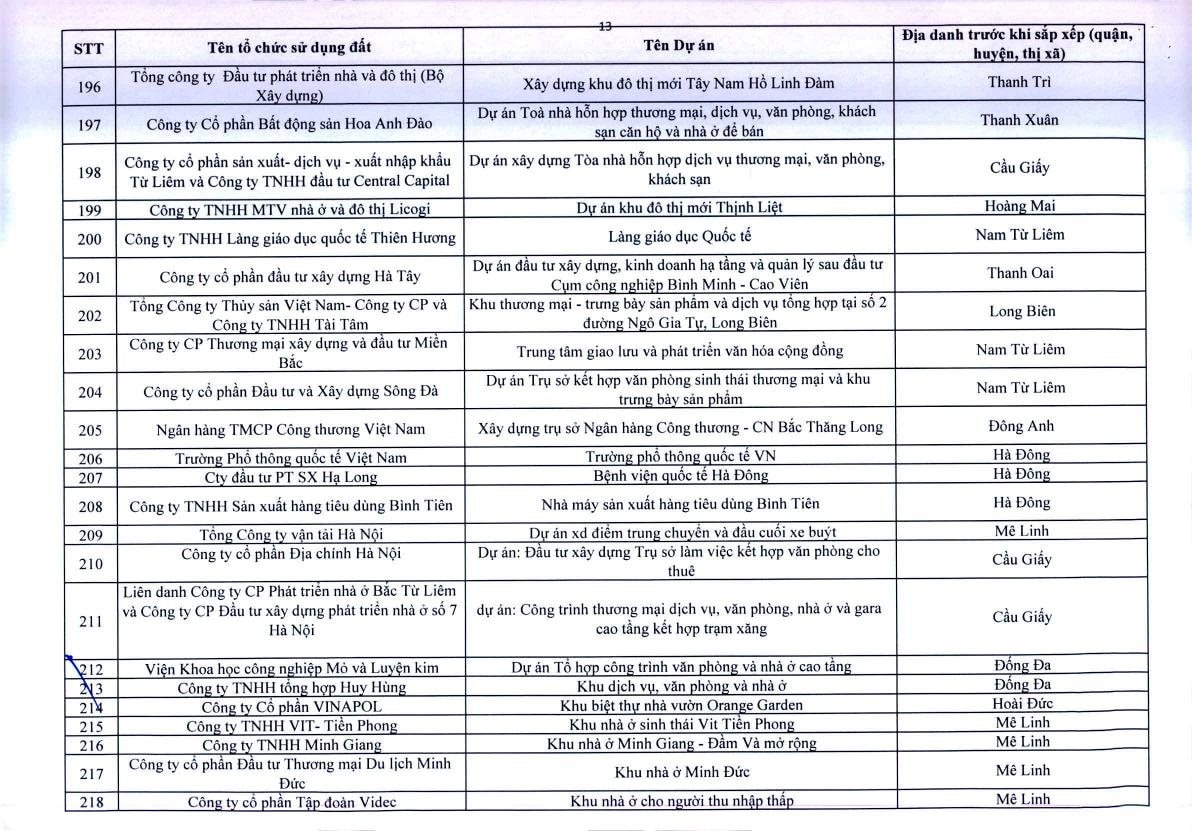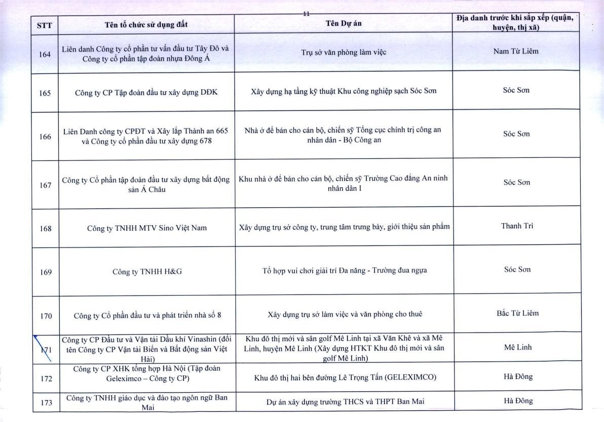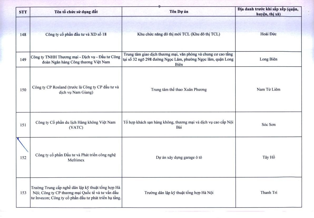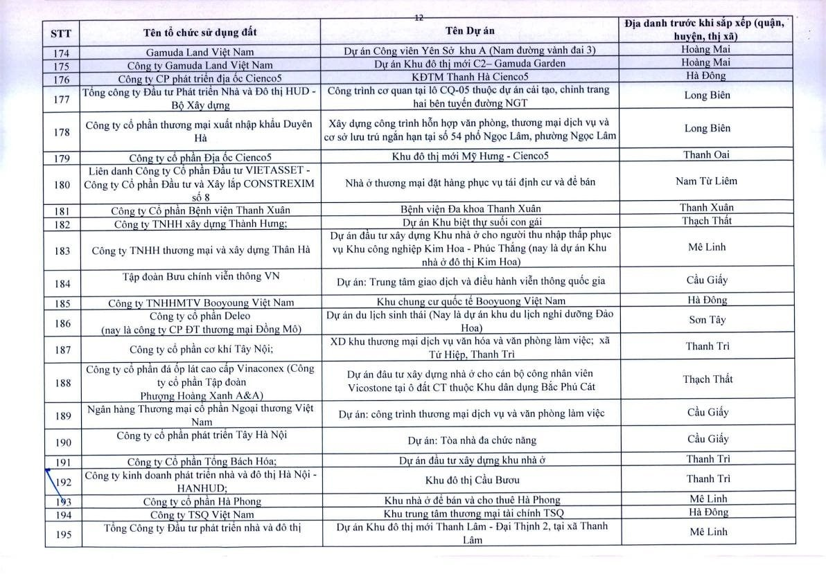 Theo Thông báo, trên địa bàn TP.Hà Nội, có 341 dự án vốn ngoài ngân sách có sử dụng đất chậm triển khai. Đáng chú ý, có nhiều doanh nghiệp bất động sản đình đám bị "điểm tên" trong danh sách ban hành kèm thông báo 396/TB-UBND của UBND TP.Hà Nội như: Công ty Liên doanh Cao ốc quốc tế Hồ Tây; Công ty CP quan hệ quốc tế- đầu tư sản xuất (CIRI); Công ty CP sản xuất- dịch vụ - xuất nhập khẩu Từ Liêm; Công ty TNHH đầu tư Central Capital; Công ty CP Bất động sản Hoa Anh Đào;...