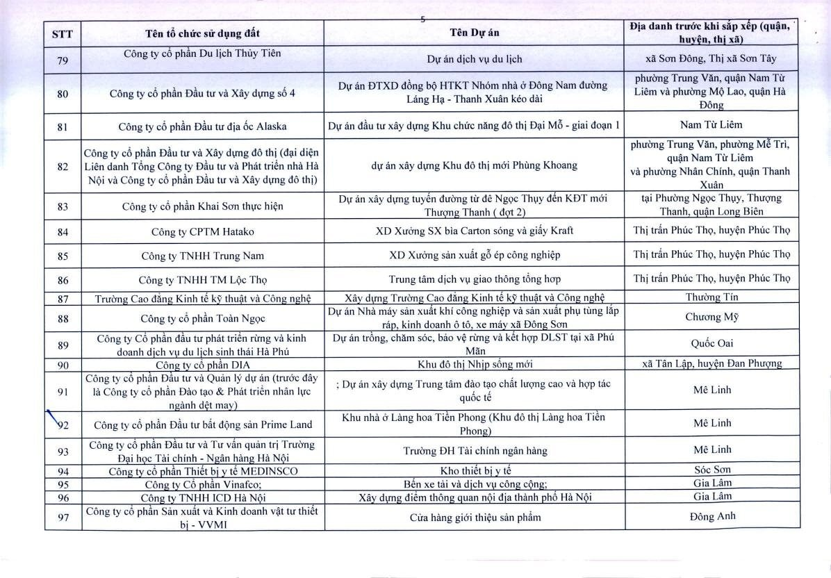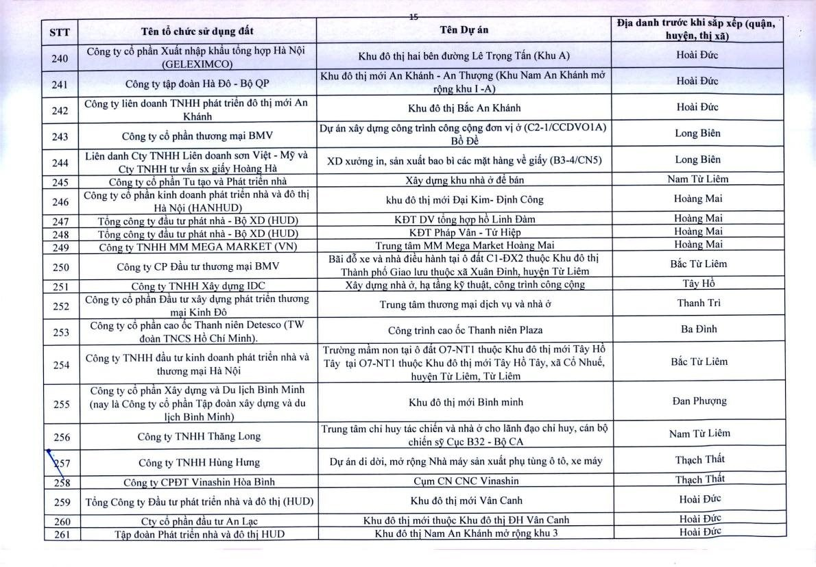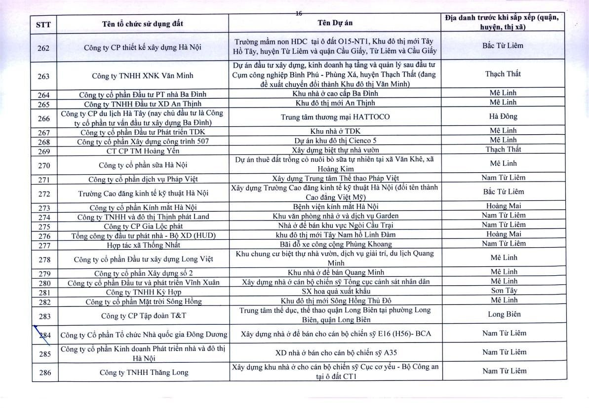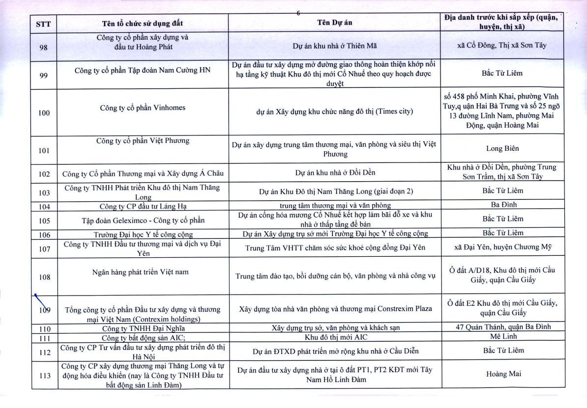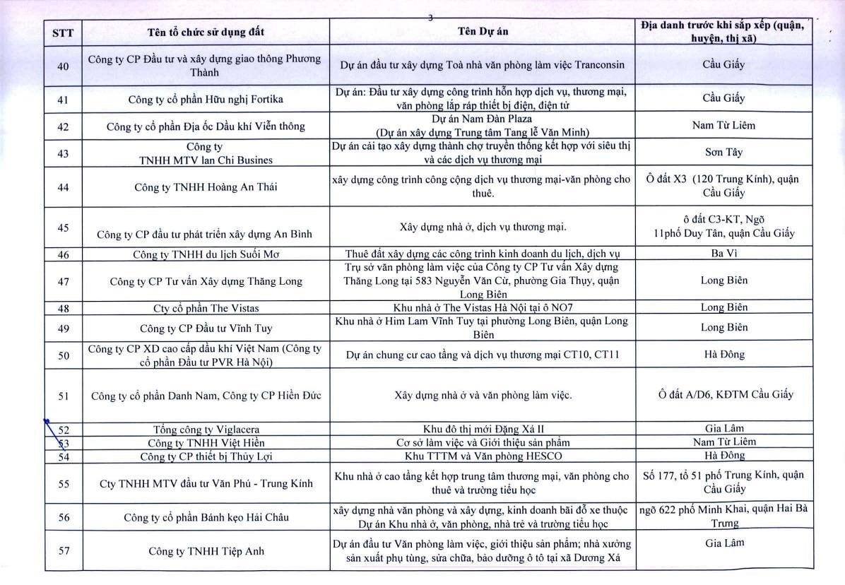 Theo Thông báo, trên địa bàn TP.Hà Nội, có 341 dự án vốn ngoài ngân sách có sử dụng đất chậm triển khai. Đáng chú ý, có nhiều doanh nghiệp bất động sản đình đám bị "điểm tên" trong danh sách ban hành kèm thông báo 396/TB-UBND của UBND TP.Hà Nội như: Công ty Liên doanh Cao ốc quốc tế Hồ Tây; Công ty CP quan hệ quốc tế- đầu tư sản xuất (CIRI); Công ty CP sản xuất- dịch vụ - xuất nhập khẩu Từ Liêm; Công ty TNHH đầu tư Central Capital; Công ty CP Bất động sản Hoa Anh Đào;...