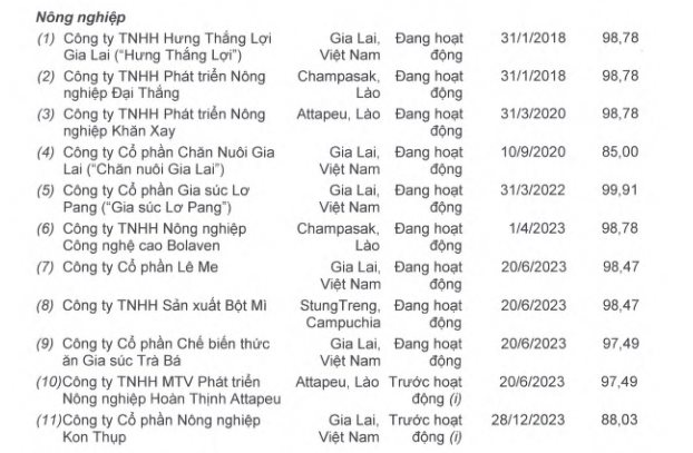 Trên báo cáo tài chính quý 3/2024, HAGL ghi nhận đang đầu tư vào 13 công ty con (trong đó có 3 đơn vị vẫn chưa bắt đầu có hoạt động sản xuất kinh doanh là Nông nghiệp Kon Thụp, Hoàn Thịnh Attapeu, HAGL Vientiane).
