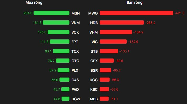 Ở chiều ngược lại, áp lực bán ròng trên HoSE tập trung mạnh nhất tại MWG với giá trị khoảng 421 tỷ, theo sau là HDB (-253 tỷ đồng). Các mã khác cũng bị "xả" trên trăm tỷ bao gồm: VHM (-185 tỷ đồng), VIC (-155 tỷ đồng) và STB (-105 tỷ đồng).