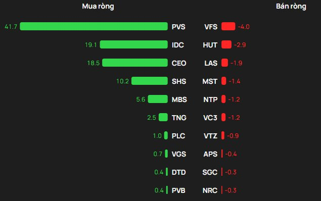 Chiều mua, khối ngoại mua ròng mạnh nhất tại PVS với giá trị khoảng 42 tỷ. Xếp tiếp theo là IDC và CEO cùng được rót ròng 19 tỷ; khối ngoại cũng mua mua ròng SHS hơn 10 tỷ đồng và MBS khoảng 6 tỷ đồng.