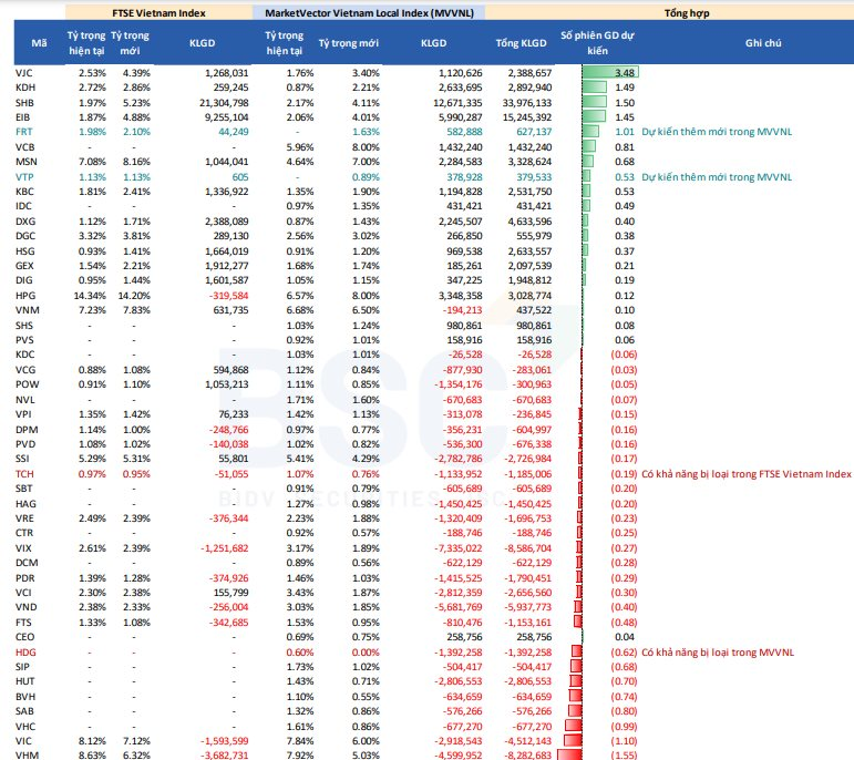 Với thay đổi trên, BSC ước tính quỹ FTSE ETF sẽ mua thêm lượng đáng kể cổ phiếu SHB (21 triệu cp), EIB (9 triệu cp), và bán mạnh VIX (-1 triệu cp), VHM (- 4 triệu cp), VIC (- 2 triệu cp) để tái cơ cấu danh mục.
