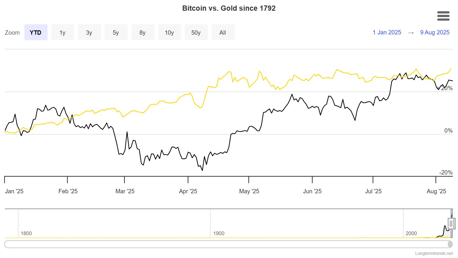 Theo Dow Jones Market Data, giá vàng tăng 30,8% từ đầu năm. Trong khi đó, tính đến ngày 9/8, Bitcoin tăng 25,1% từ đầu năm. Cả vàng và Bitcoin đều vượt trội so với chứng khoán Mỹ.