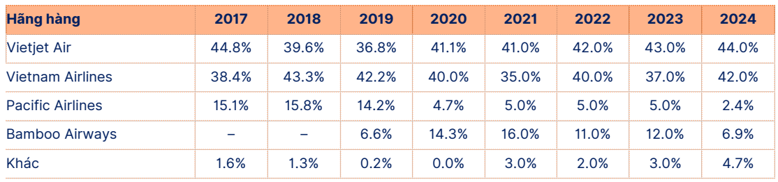 Cùng với sự phục hồi, thị trường hàng không cũng bước vào cuộc cạnh tranh đầy khốc liệt giữa các hãng. Hiện tại, Vietjet Air đang giữ thị phần lớn nhất, cả nội địa lẫn quốc tế (44%, tính đến cuối năm 2024), nhờ mô hình hàng không chi phí thấp. Trong khi, Vietnam Airlines cũng tăng mạnh thị phần lên 42% vào cuối năm 2024, bỏ xa các đối thủ nhỏ hơn như Bamboo Airways (6,9%) và Pacific Airlines (2,4%).