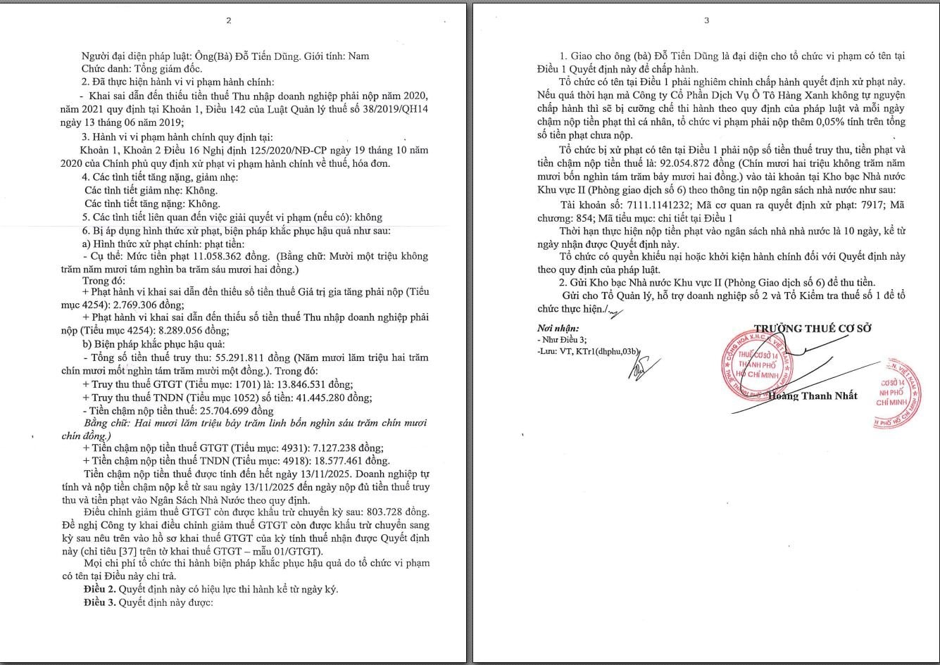 Theo đó, CTCP Dịch vụ Ô tô Hàng Xanh (Haxaco, MCK: HAX, sàn HoSE) vừa công bố thông tin bất thường về việc nhận được Quyết định số 1374/QĐ-XPHC ngày 13/11/2025 của Thuế cơ sở 14 Thành phố Hồ Chí Minh về việc xử phạt vi phạm hành chính về thuế.