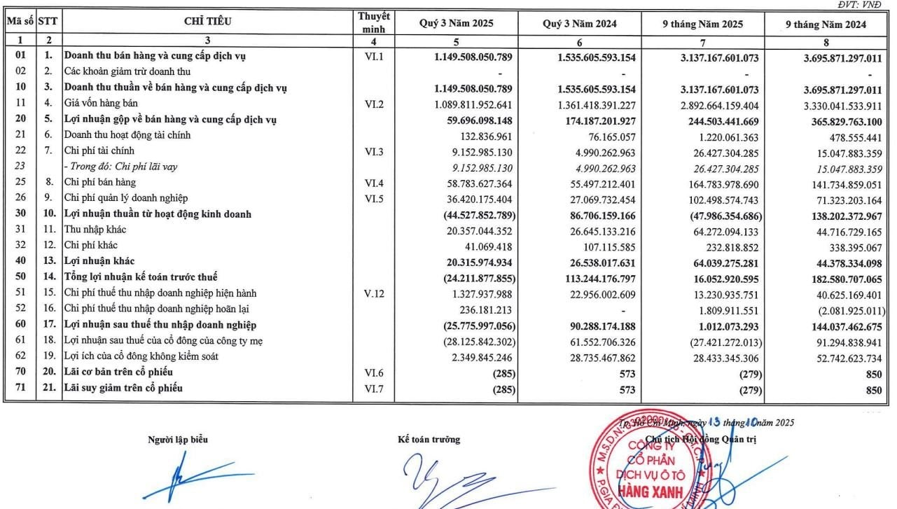 Về tình hình kinh doanh, lũy kế 9 tháng đầu năm 2025, Haxaco mang về doanh thu thuần gần 3.137,2 tỷ đồng, giảm 15% so với 9 tháng đầu năm 2024; lợi nhuận sau thuế thu nhập doanh nghiệp chỉ đạt hơn 1 tỷ đồng, giảm tới 99% so với cùng kỳ.