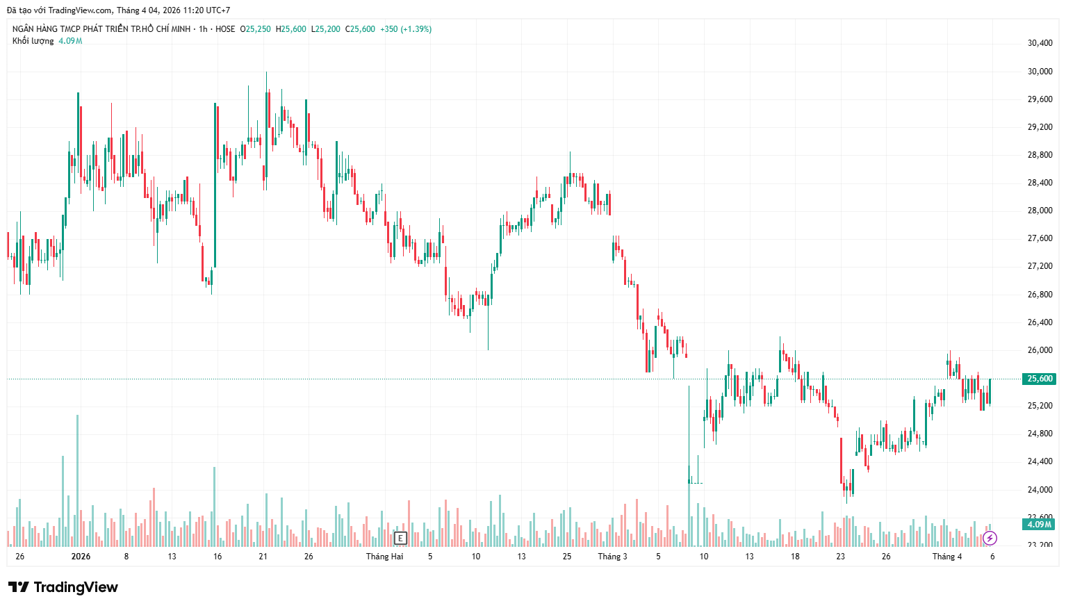 Kết thúc phiên giao dịch ngày 3/4/2026, giá cổ phiếu HDB ở mức 25.600 đồng/cổ phiếu, giảm khoảng 10% so với đầu năm.