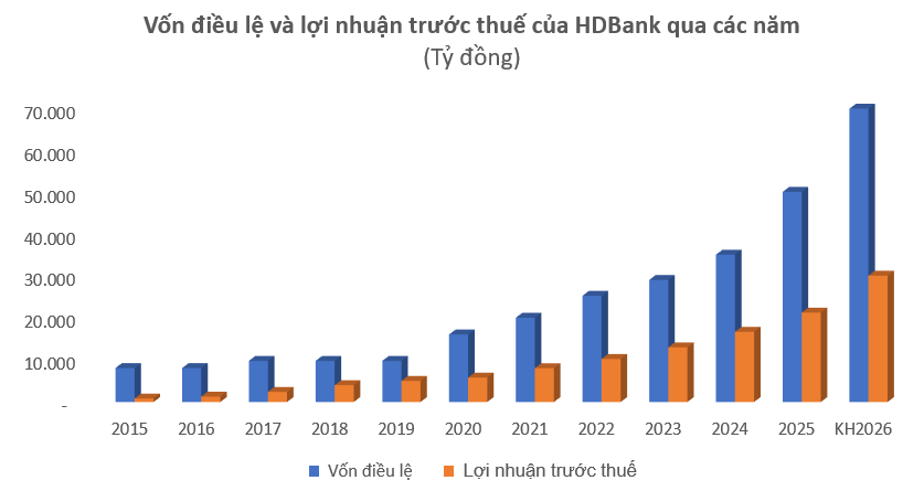 Ở phương diện vốn, HDBank dự kiến nâng vốn điều lệ lên 69.857 tỷ đồng và vốn chủ sở hữu lên 101.535 tỷ đồng trong năm 2026. Đồng thời, ngân hàng lên kế hoạch duy trì mức cổ tức năm 2025 ở tỷ lệ 30%.