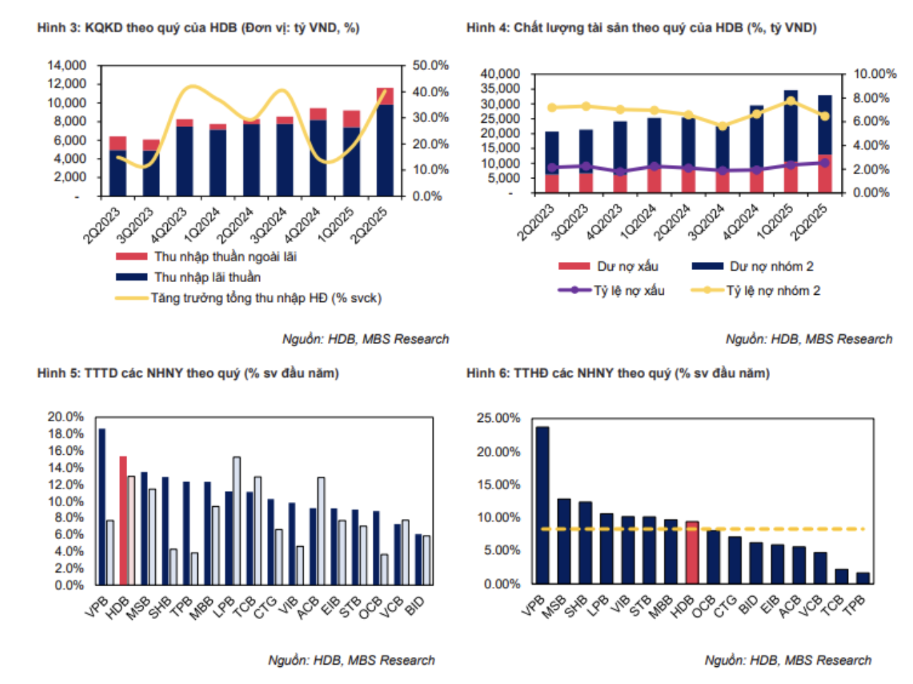 MBS cho biết, chất lượng tài sản của HDBank tại cuối quý 2/2025 không có nhiều thay đổi so với cuối 2024. Trong nửa cuối năm 2025, nhóm phân tích dự kiến áp lực gia tăng nợ xấu của HDBank sẽ giảm nhờ tăng trưởng tín dụng cao hơn tập trung vào khách hàng doanh nghiệp vừa và nhỏ (CMB/SME) vốn có nhu cầu tín dụng cao và chất lượng tài sản tốt hơn so với khách hàng bán lẻ. Với xu hướng gia tăng cho vay trung dài hạn tập trung vào mảng cho vay theo chuỗi cung ứng sẽ giúp bình ổn khả năng bung nợ xấu khi tình hình kinh tế thuận lợi hơn, đặc biệt sau khi bức tranh thuế quan rõ ràng.