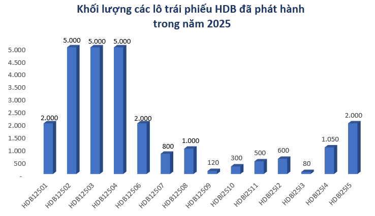 Trong năm 2025, ngân hàng này đã phát hành 15 lô trái phiếu có tổng khối lượng 25.450 trái phiếu, tương ứng với giá trị thu về 25.450 tỷ đồng.