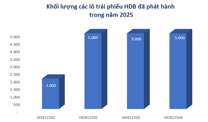 Trong tháng 9, HDBank đã chào bán thành công 2 lô trái phiếu là HDB12502 và HDB12503, tổng khối lượng 10.000 trái phiếu, mệnh giá 100 triệu đồng/trái phiếu, tổng giá trị phát hành 1.000 tỷ đồng. Trái phiếu có kỳ hạn 8 năm, đáo hạn vào tháng 9/2033, với lãi suất phát hành dự tính 7,47%/năm.