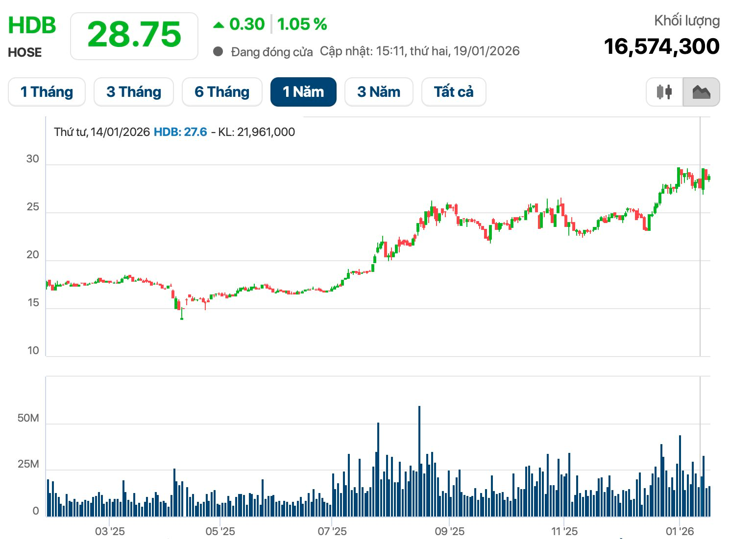 Ngày 13/1 vừa qua, gần 1,15 tỷ cổ phiếu HDB từ đợt phát hành cuối năm ngoái của HDBank đã được niêm yết bổ sung. Số lượng cổ phiếu này sẽ được giao dịch từ ngày 28/1 tới đây. Trước đó, HDBank đã phát hành hơn 964,8 triệu cổ phiếu để trả cổ tức với tỷ lệ 25% và gần 181 triệu cổ phiếu để tăng vốn cổ phần từ nguồn vốn chủ sở hữu với tỷ lệ 4,69%.