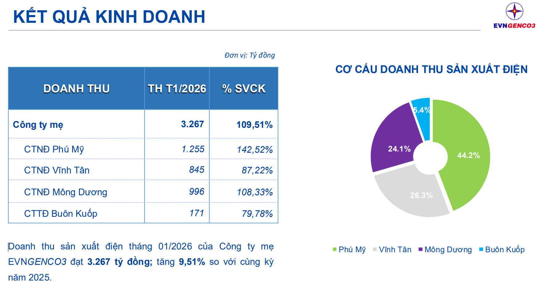 Qua đó, doanh thu sản xuất điện tháng 1/2026 của công ty mẹ EVNGENCO3 đạt 3.267 tỷ đồng; tăng 9,51% so với cùng kỳ năm 2025.