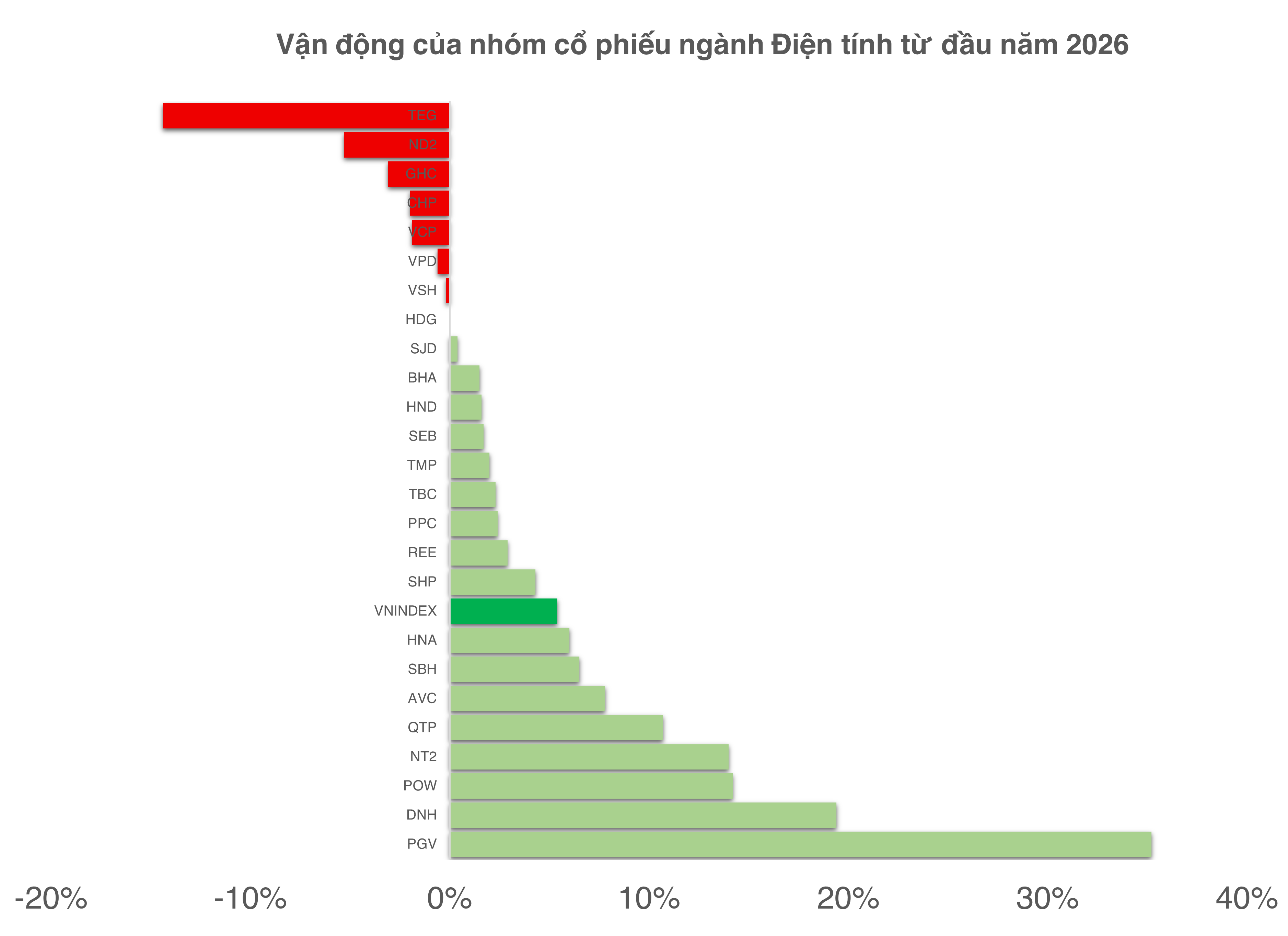 Tính đến hết phiên giao dịch ngày 27/2, PGV ghi nhận mức tăng 35,2% từ đầu năm 2026, trở thành mã tăng mạnh nhất trong nhóm 25 cổ phiếu ngành điện được theo dõi trên toàn thị trường.