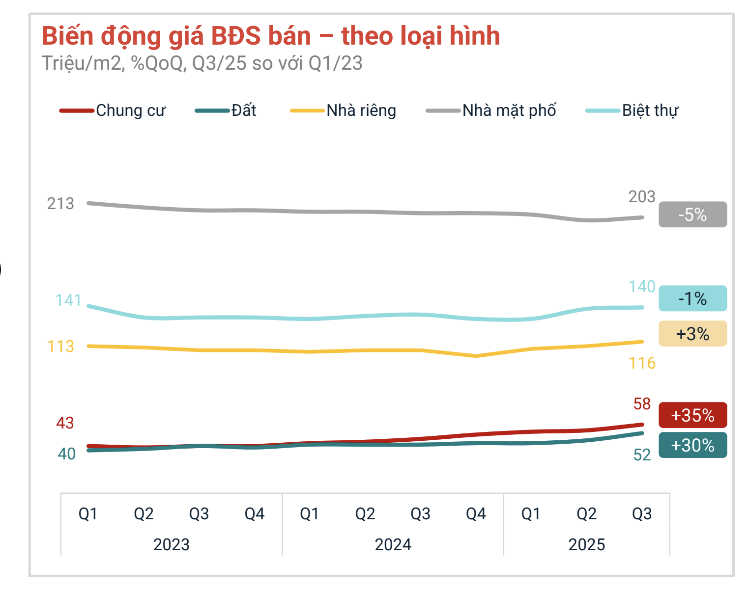Dẫu vậy, đà tăng giá của đất nền vẫn đứng “top” so với nhà riêng, biệt thự, chỉ sau chung cư. Dữ liệu mới đây từ Batdongsan.com.vn chỉ ra, đất nền tăng giá 30% trong vòng 2 năm; chung cư là 58%, nhà riêng 3%. Trong khi loại hình nhà mặt phố, biệt thự giá giảm từ 1-5%.