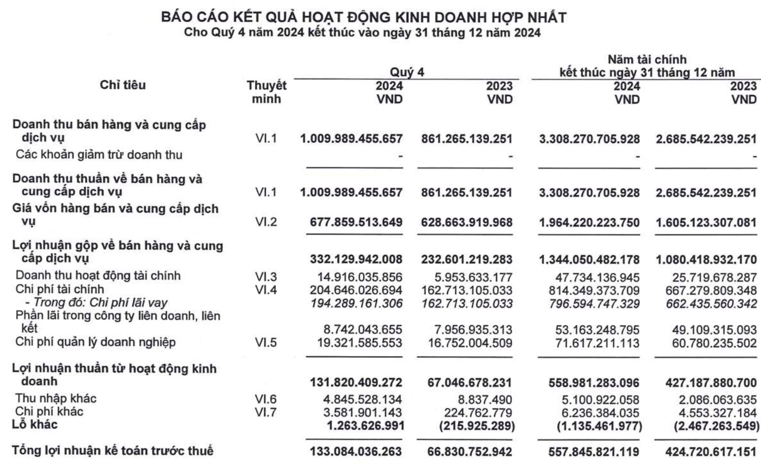 Luỹ kế cả năm 2024, Công ty ghi nhận doanh thu 3.308 tỷ đồng, tăng hơn 23%. Trong đó,