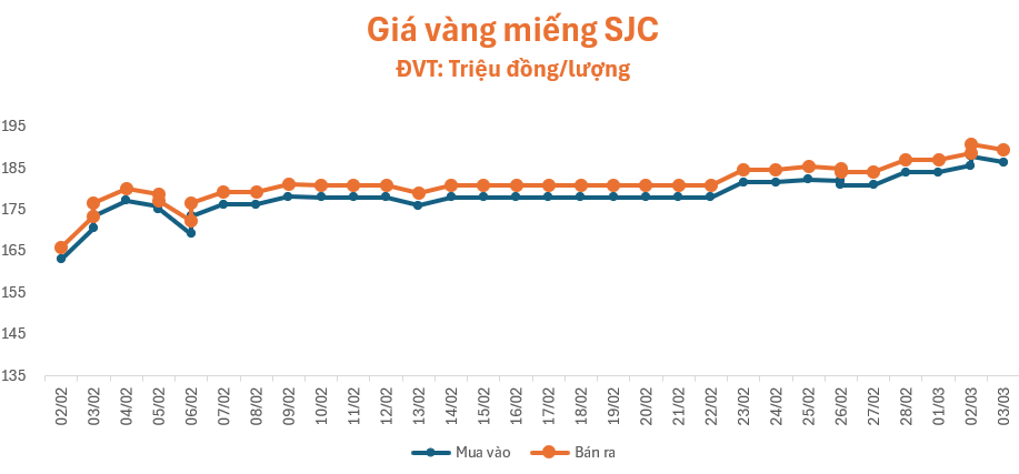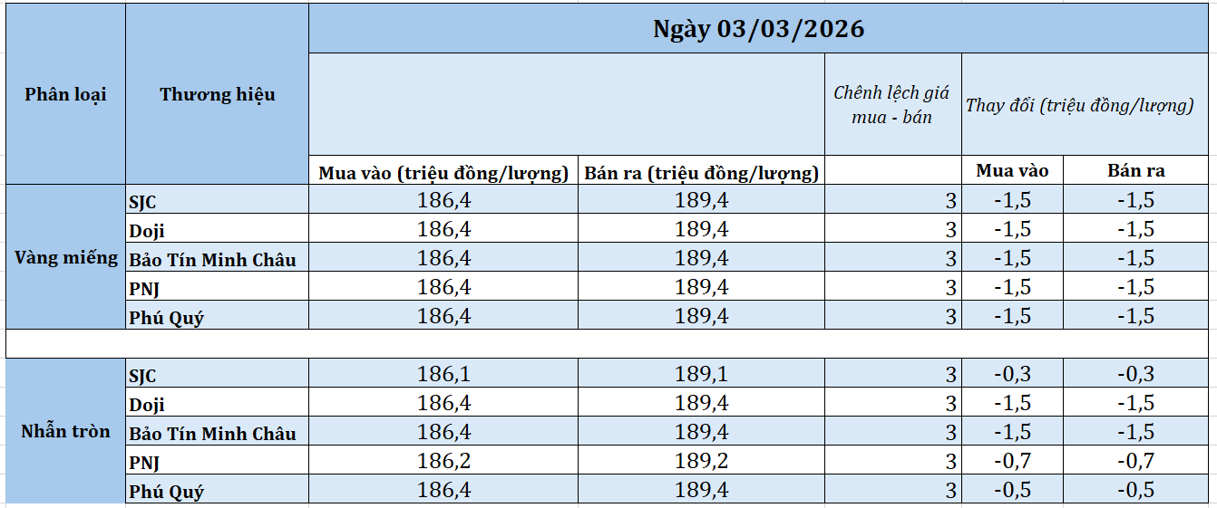 Giá vàng đảo chiều giảm mở đầu phiên giao dịch sáng nay (03/03). Lúc 9 giờ, giá vàng miếng SJC tại cửa hàng SJC, Phú Quý, Bảo Tín Minh Châu, PNJ và Doji đều niêm yết ở mức 186,4 – 189,4 triệu đồng/lượng (mua – bán), giảm 1,5 triệu đồng/lượng so với giá khảo sát chiều qua, chênh lệch mua – bán ở ngưỡng 3 triệu đồng/lượng.