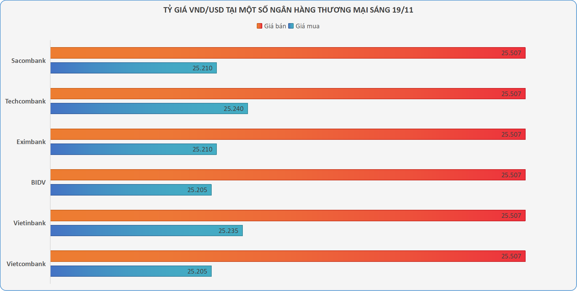 Techcombank giá USD đang niêm yết ở mức 25.240 - 25.507 VND/USD, tăng 20 đồng ở chiều mua và 5 đồng ở chiều bán so với phiên trước. Trong khi Sacombank giá USD điều chỉnh tăng 10 đồng ở chiều mua và 5 đồng ở chiều bán, đang niêm yết ở mức 25.210 - 25.507 VND/USD.